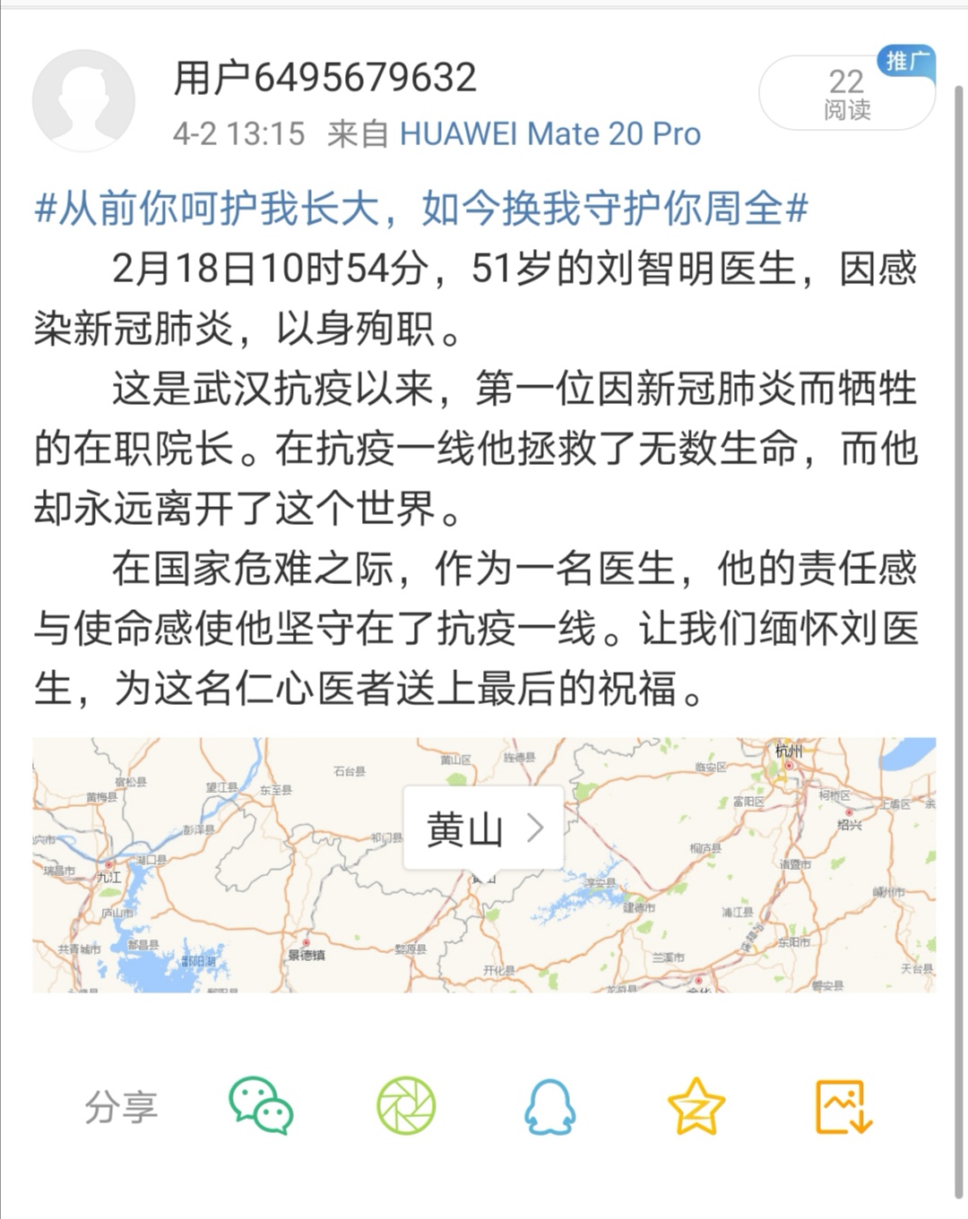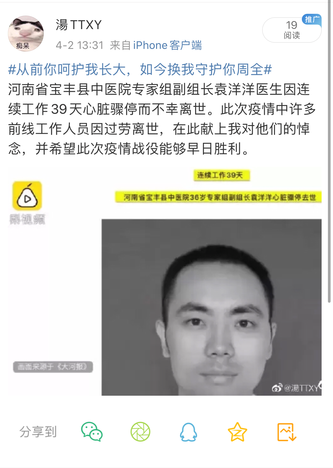 此外,许多同学通过话题#从前你呵护我长大,如今我守护你周全#感谢在此次疫情中做出贡献的杰出人士,缅怀为战胜疫情而牺牲的英烈。此次疫情中许多医护人员、人民警察、社区工作者等都奋战在抗疫一线,而病毒猖狂不断侵蚀越来越多的人,就连最先发现新冠病例的李文亮医生也未能幸免,李文亮医生于二月一日确诊新冠肺炎,并于短短六天后抢救无效离开人世,李文亮医生的离世令全国人民遗憾不已。除李文亮医生外,更有数以千计的疫情前线工作人员牺牲在工作岗位上。微博ID为“憨憨Psyche”的同学回忆了河南省宝丰县中医院专家组副组长袁洋洋医生的故事,袁洋洋医生因连续工作39天心脏骤停而不幸离世。另一位微博ID为“Zora-BK”的同学则动情讲述了武汉市武昌医院原经理刘智明医生的故事,刘智明医生在抗击疫情一线不幸感染新冠肺炎,经全力救治无效与世长辞,年仅51岁。同学们情真意切地向英雄们致敬,活动参与者向呈同学表示,“哪有什么岁月静好,只不过有人替我们负重前行,因此我们不能放松警惕,需要继续坚持不懈地防控疫情,不辜负奋战前线的人们的努力”。