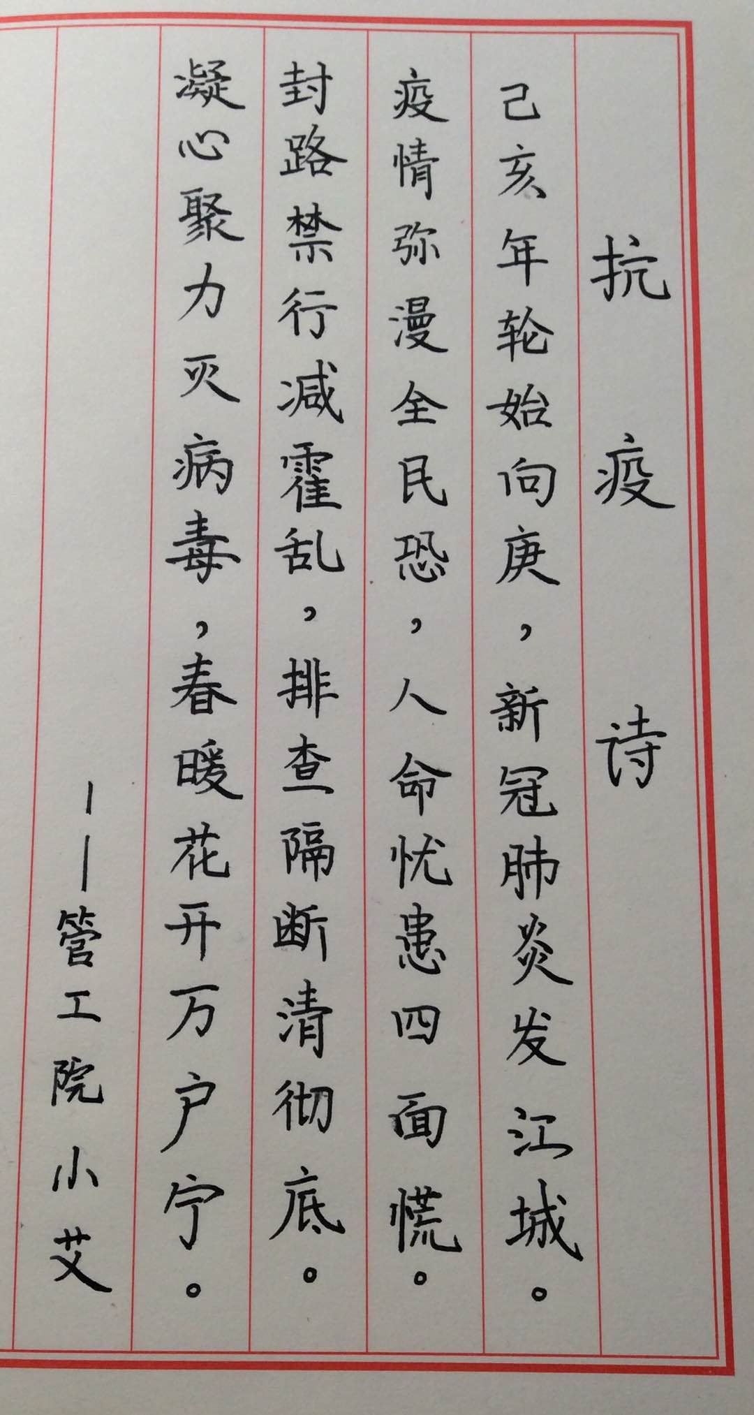 本次活动展示了同学们的书法风采,丰富了校园文化生活,深刻反映了我院学子防控疫情的坚定决心和必胜信念,希望文字的温度与力量向负重前行的勇士们致敬,为武汉祈愿祝福!我们相信,中国必胜,抗疫必胜!
