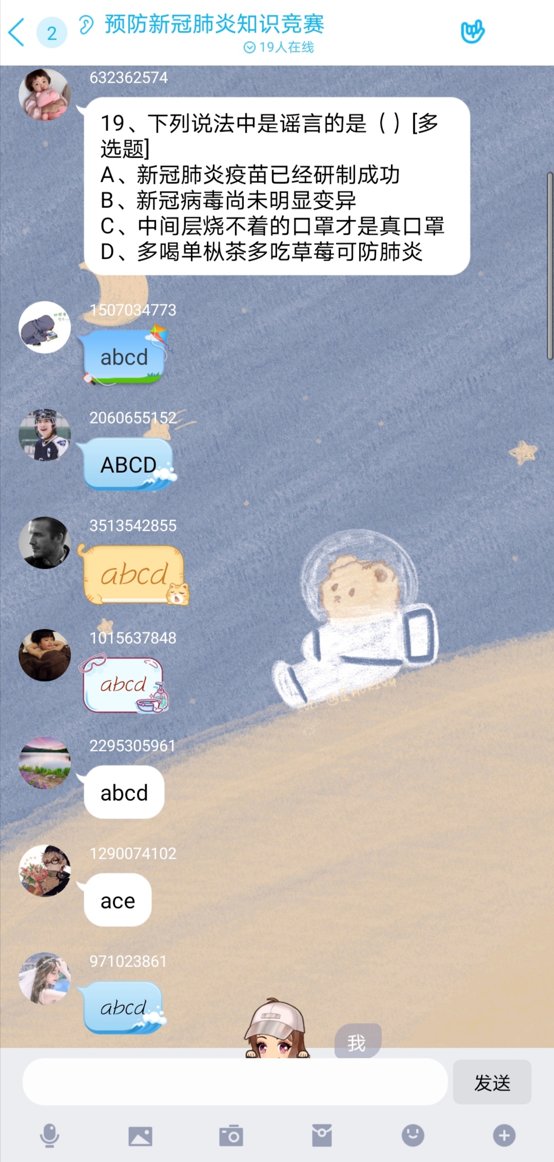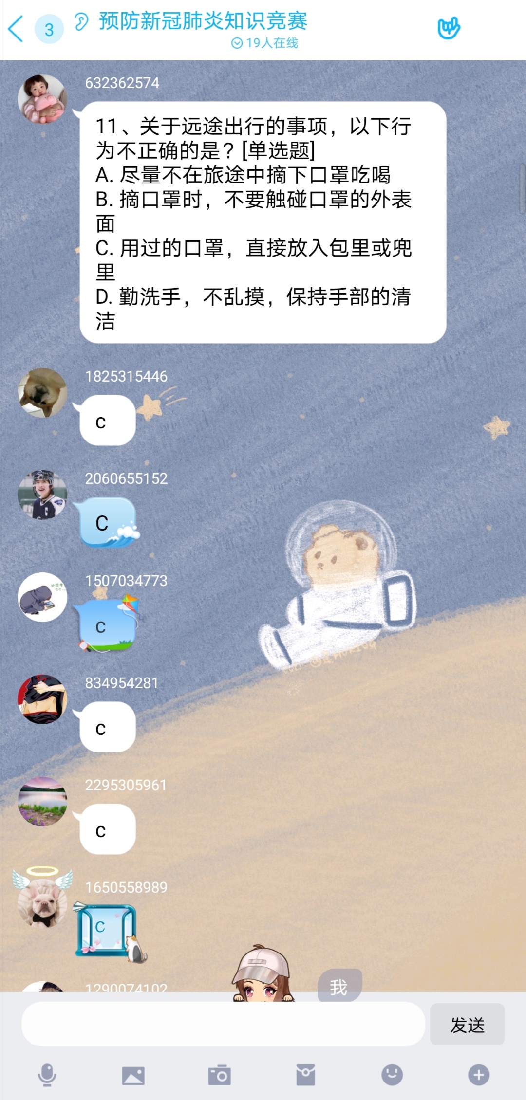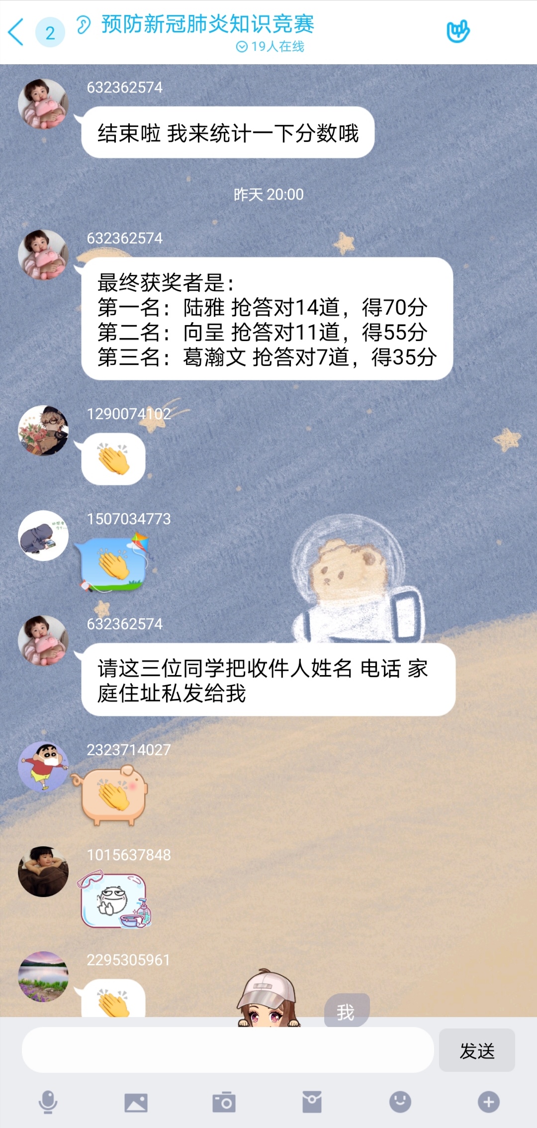 因疫情原因,活动在线上开展,XCsports同学积极参与。3月4日晚,知识竞赛正式开始,院员工会外联部部长张佳仪作为主持人在QQ群内发布竞赛题目,参赛同学火热抢答。题目紧密结合新冠肺炎相关知识,例如远途出行应该注意哪些行为?如何做好自我防护?如果成为密切接触者应该避免什么?比赛过程精彩激烈,大家你追我赶,最终在“公开,公正,公平”的原则下,竞赛负责人统计出得分排名前三的优胜者在群内公告,并将快递精美礼品送达。