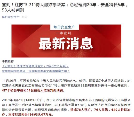 附件1:关于传达学习《宣判!江苏“3·21”特大爆炸事故案:总经理判20年,安全科长5年,53人被判刑》的通知
