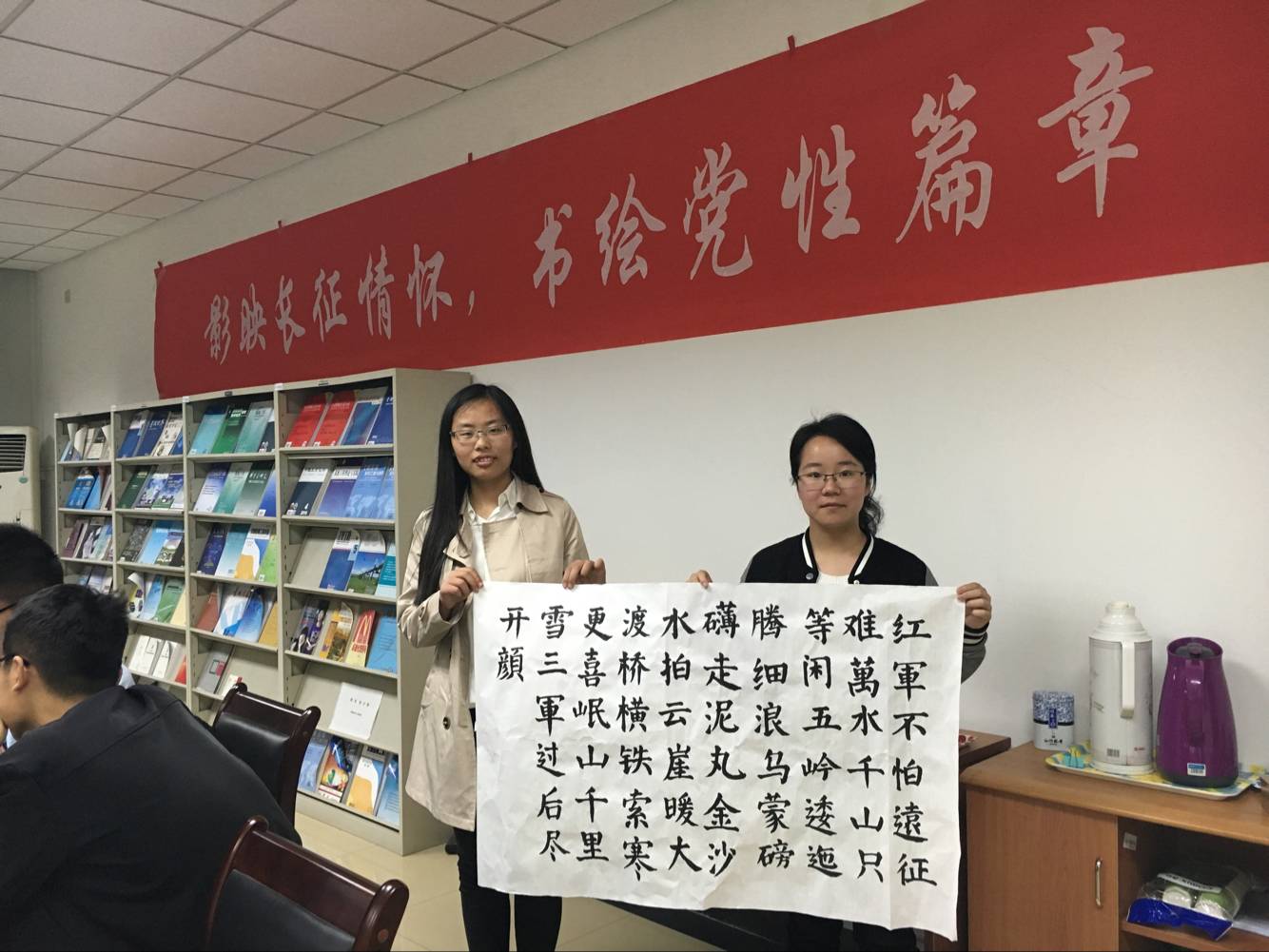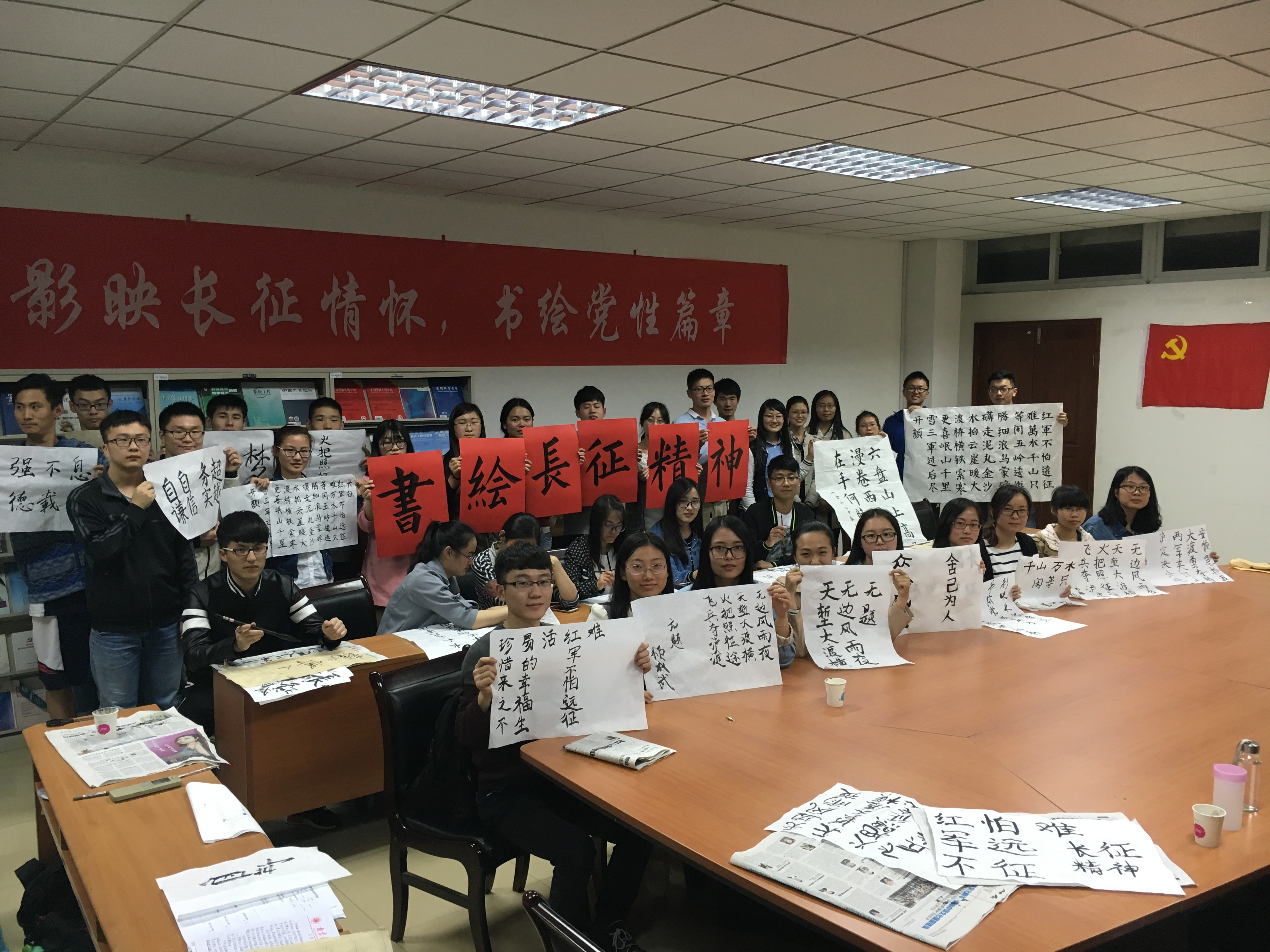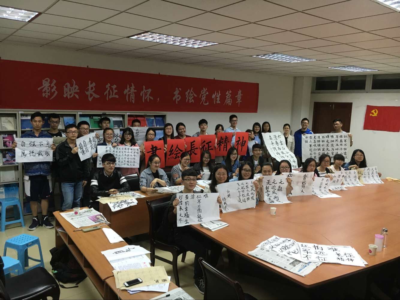 整个活动分为影片观赏、历史回顾、书绘长征以及“信”说长征四个部分。序幕在铿锵有力的《七律长征》诗朗诵中缓缓拉开。大家首先一起观看了纪录片《长征》,回顾长征的整个过程。主持人将当年的路线示意图投影到墙上,邀请数位同学上台标注出长征中主要的途径地点。大家踊跃参与,齐心合力将整个长征路线完整再现。进入书绘长征环节,管理1401班王中奇同学现场表演书法为活动写下“书绘长征精神”六个大字,现场的同学也纷纷拿起毛笔写下对长征的真实感受。最后,现场每一名同学分别将自己对长征的体悟以短信形式发送给各支部组织委员,整理后在支部群中共享、互勉。