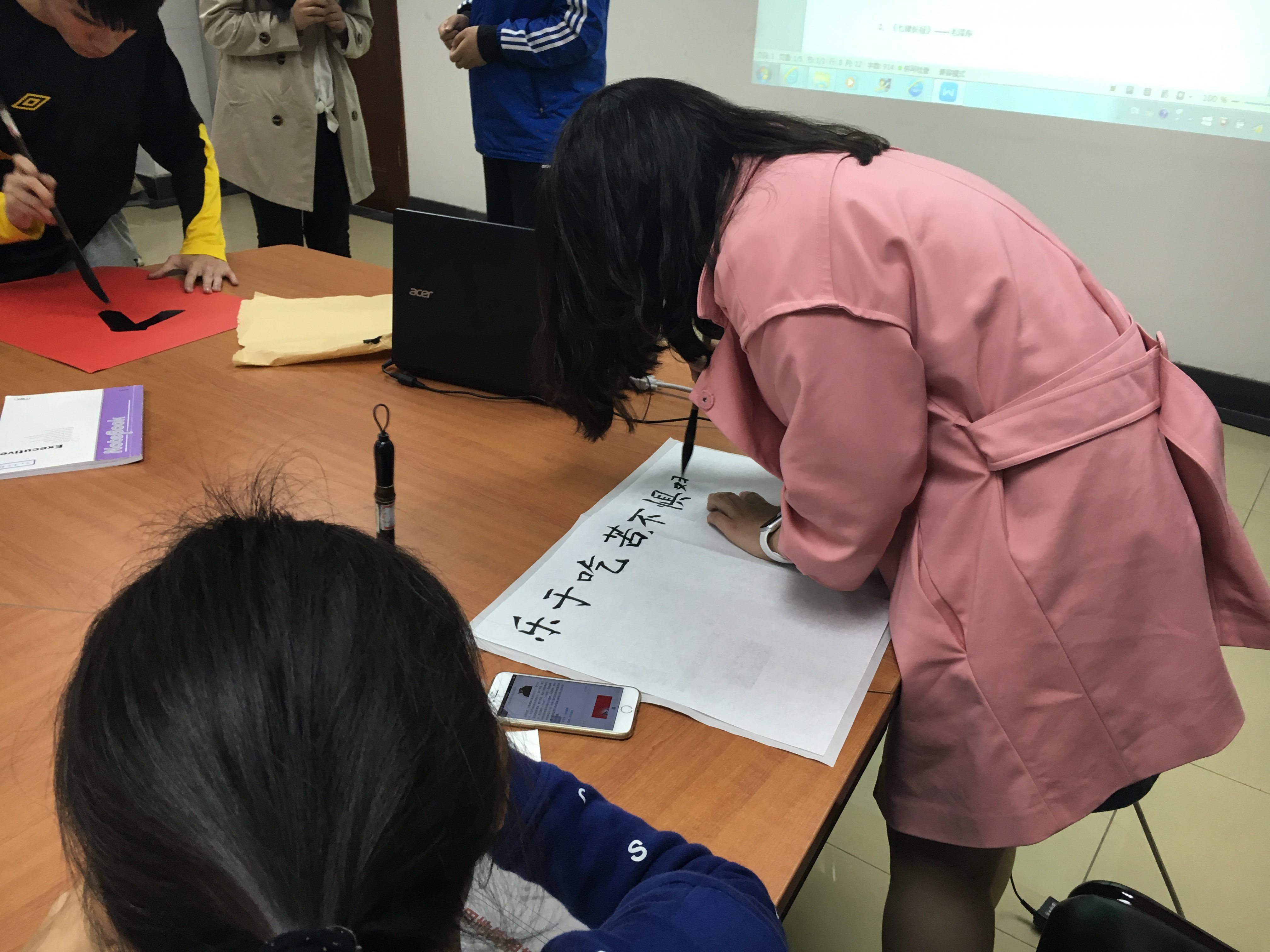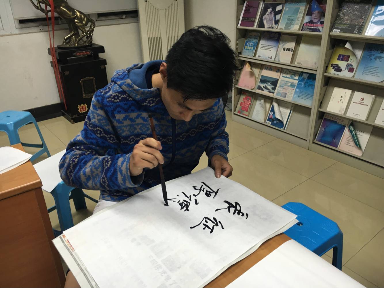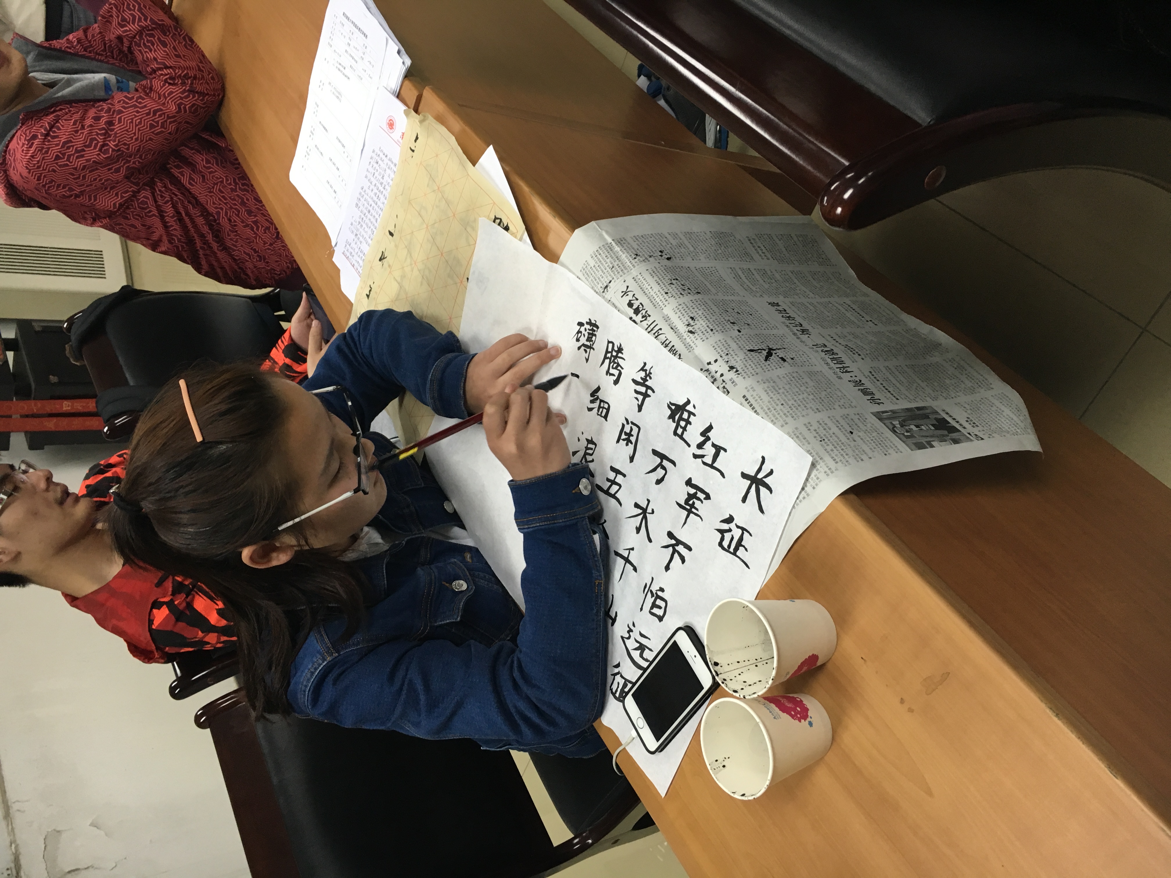 整个活动分为影片观赏、历史回顾、书绘长征以及“信”说长征四个部分。序幕在铿锵有力的《七律长征》诗朗诵中缓缓拉开。大家首先一起观看了纪录片《长征》,回顾长征的整个过程。主持人将当年的路线示意图投影到墙上,邀请数位同学上台标注出长征中主要的途径地点。大家踊跃参与,齐心合力将整个长征路线完整再现。进入书绘长征环节,管理1401班王中奇同学现场表演书法为活动写下“书绘长征精神”六个大字,现场的同学也纷纷拿起毛笔写下对长征的真实感受。最后,现场每一名同学分别将自己对长征的体悟以短信形式发送给各支部组织委员,整理后在支部群中共享、互勉。