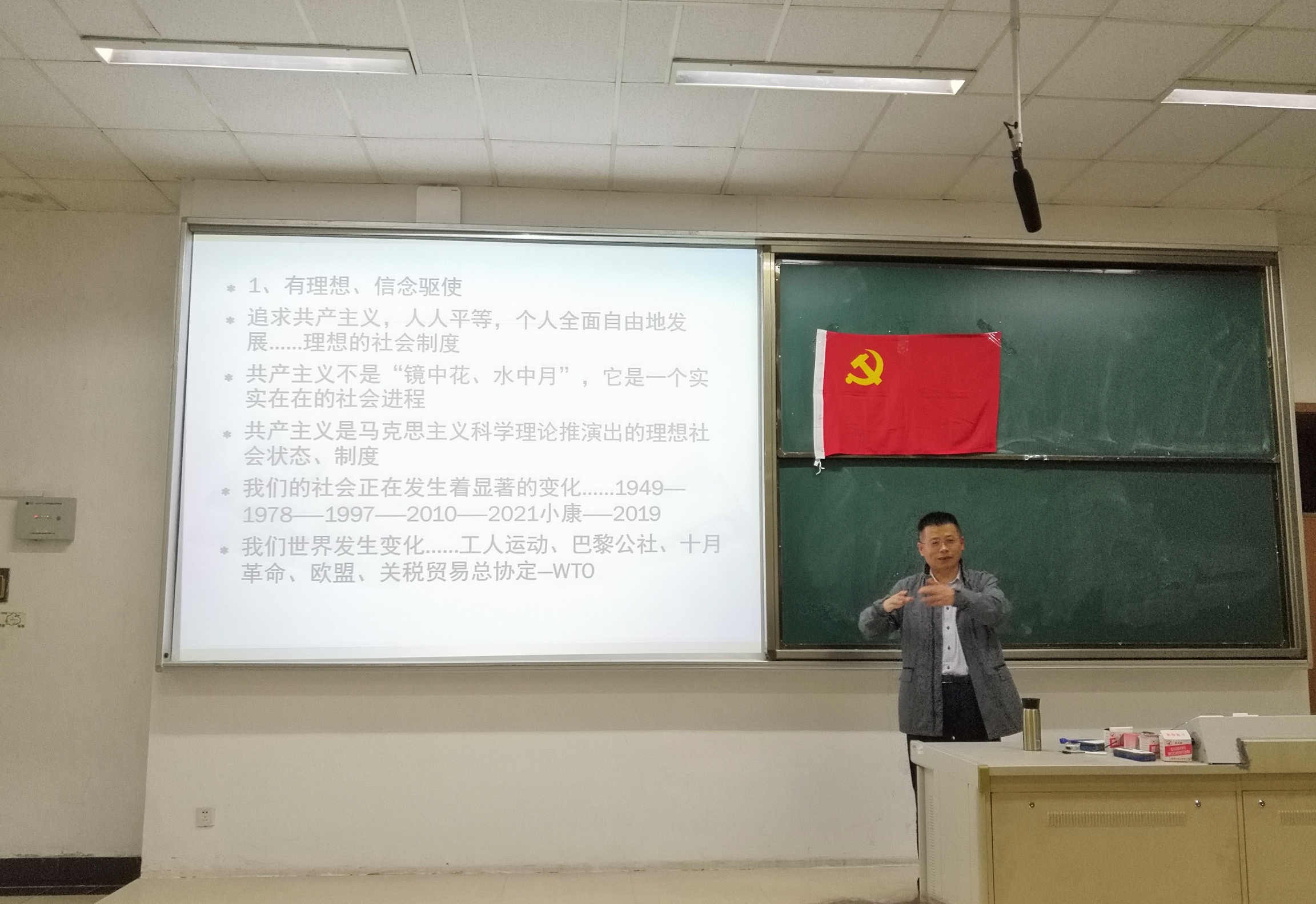 开班典礼结束后,胡永远书记为同学们进行了有关党的知识的授课。党课内容包括“中国共产党的性质”和“中国共产党的纲领”。在课堂上,胡永远书记向同学们讲述了政党的相关概念和历史演变、党的性质以及中国共产党的四方面特性等知识。期间胡书记还向同学们展示了自己前往延安革命旧址参观的照片,给同学们更直观地感受。