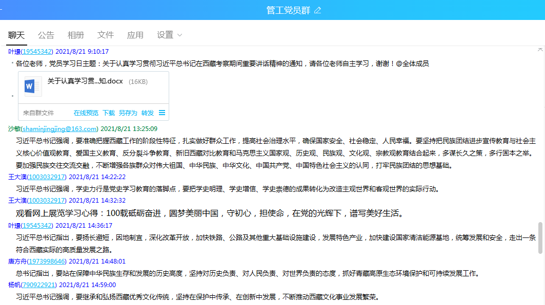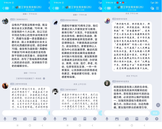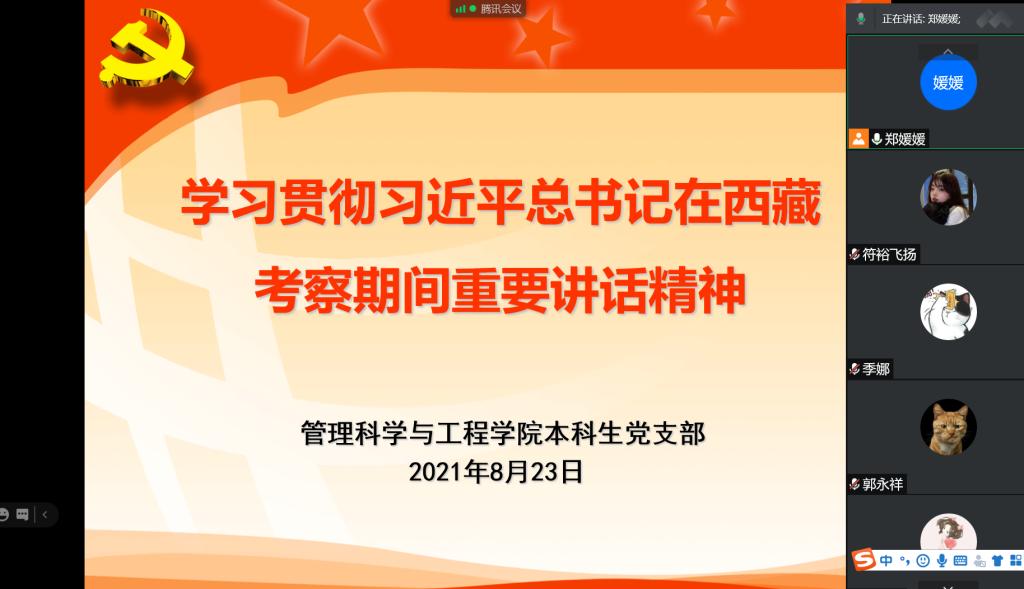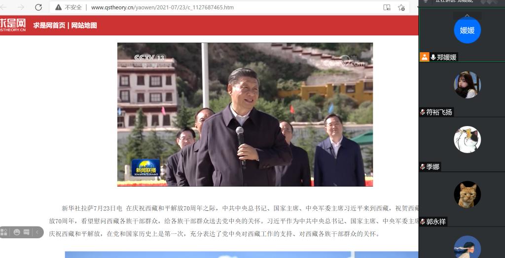 8月21日上午9点,XCsports教工党支部在腾讯会议认真学习贯彻习近平总书记在西藏考察期间重要讲话精神,会议由支部副书记沙敏主持,会后党员们积极在党支部QQ群中发表学习感想。8月23日,研究生党支部通过腾讯会议,在线学习了习近平总书记在西藏考察期间重要讲话精神,支部书记吴筱月主持会议。8月23日晚,本科生党支部利用腾讯会议,组织员工党员集中学习了习近平总书记在西藏考察期间重要讲话精神,集中观看“新华视频:习近平总书记来到西藏,祝贺西藏和平解放70周年,看望慰问西藏各族干部群众”;学习“求是网”文章《习近平在西藏考察时强调全面贯彻新时代党的治藏方略,谱写雪域高原长治久安和高质量发展新篇章》和“共产党员网”文章《我们的传家宝│老西藏精神》。支部书记郑媛媛老师主持会议,员工党员们积极交流学习体会。