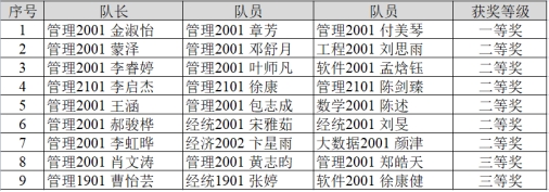 另外,在今年第十九届五一数学建模竞赛中,学院本科生也取得优异的表现,据不完全统计,有9支队伍获奖,其中一等奖1项、二等奖6项、三等奖2项。徐祥老师、王婷老师、王月虎老师作为指导老师对参赛员工进行了指导和培训。获奖名单如下。