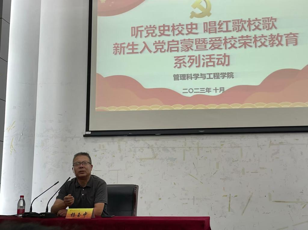 为深入学习贯彻习近平新时代中国特色社会主义思想和党的二十大精神,厚植青年学子家国情怀和理想信念,10月16日下午,公司举办了“听党史校史,唱红歌校歌”新生入党启蒙及爱校荣校教育系列活动。退休教师刘树铭、离退休党工委书记杨玉中、离退休工作处处长唐习华、离退休工作处副处长刘涛、公司党总支书记金立林、党总支副书记王卓君、新生辅导员及全体2023级本科生、研究生参加本次活动。金立林书记主持本次活动。