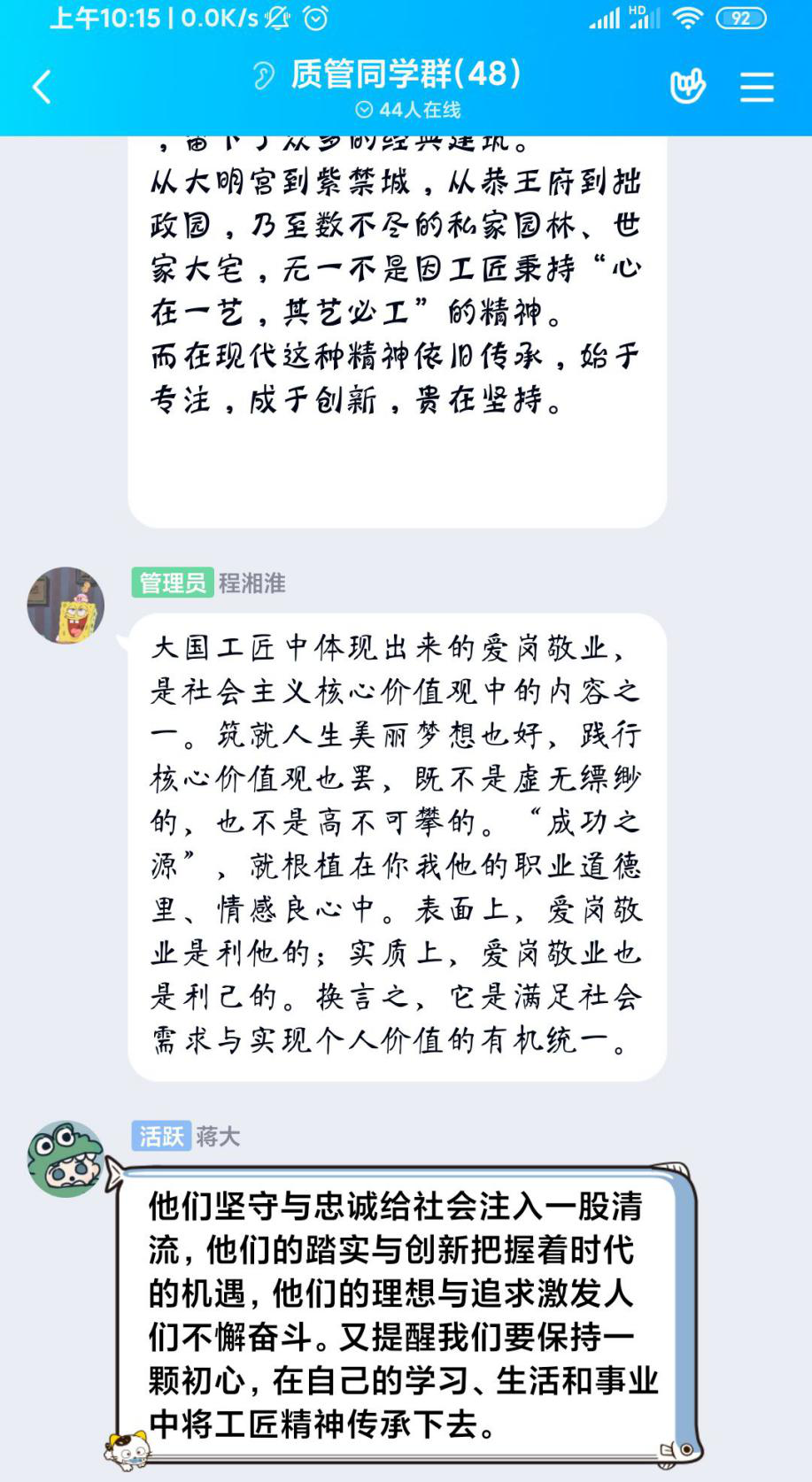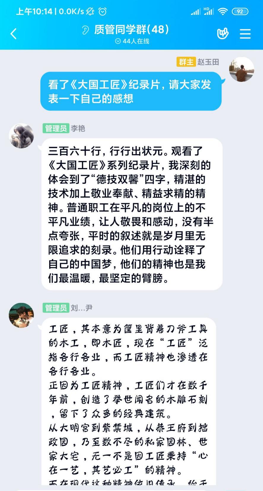 为了深化对工匠精神和劳模精神的理解,以榜样的人格魅力感染和教育员工,2020年4月30日,在五一劳动节来临之际,质管1701班积极响应公司五一劳动节“五个一”活动,质管1701班举办“观《大国工匠》,学工匠精神”“影像志”活动,全班同学在线一起观看了《大国工匠》纪录片,并交流观影感想。