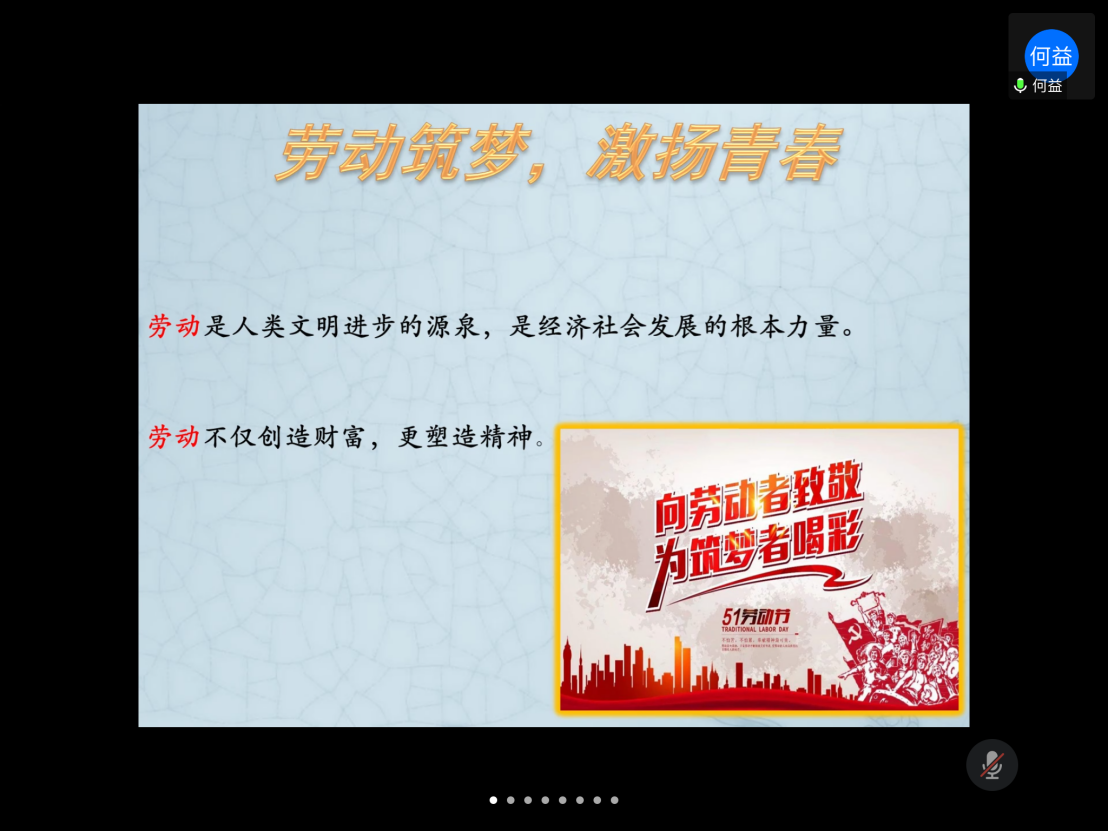 在五一劳动节到来之际,工程1701班积极响应公司号召,通过腾讯会议在线举办了以“劳动筑梦,激扬青春”为主题的班会,并共同观看了影片《匠人·匠心(一)》,同学们在观看完毕后,也都纷纷发表了感想。
