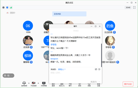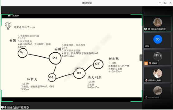 11月17日晚,公司质管1801班依托腾讯会议平台依次举办了考研、出国、就业三场经验交流会。目前,作为已经步入大三的同学们,正处于对未来发展道路的抉择期。为了让大家不盲目、不盲从,有针对性地备战考研、合理择校,规避找工作时的各种碰壁,应班主任王月虎老师的邀请,公司2015级与2017级的部分优秀学长学姐就上述话题分享了宝贵经验。本次交流会由胡嘉文同学主持。