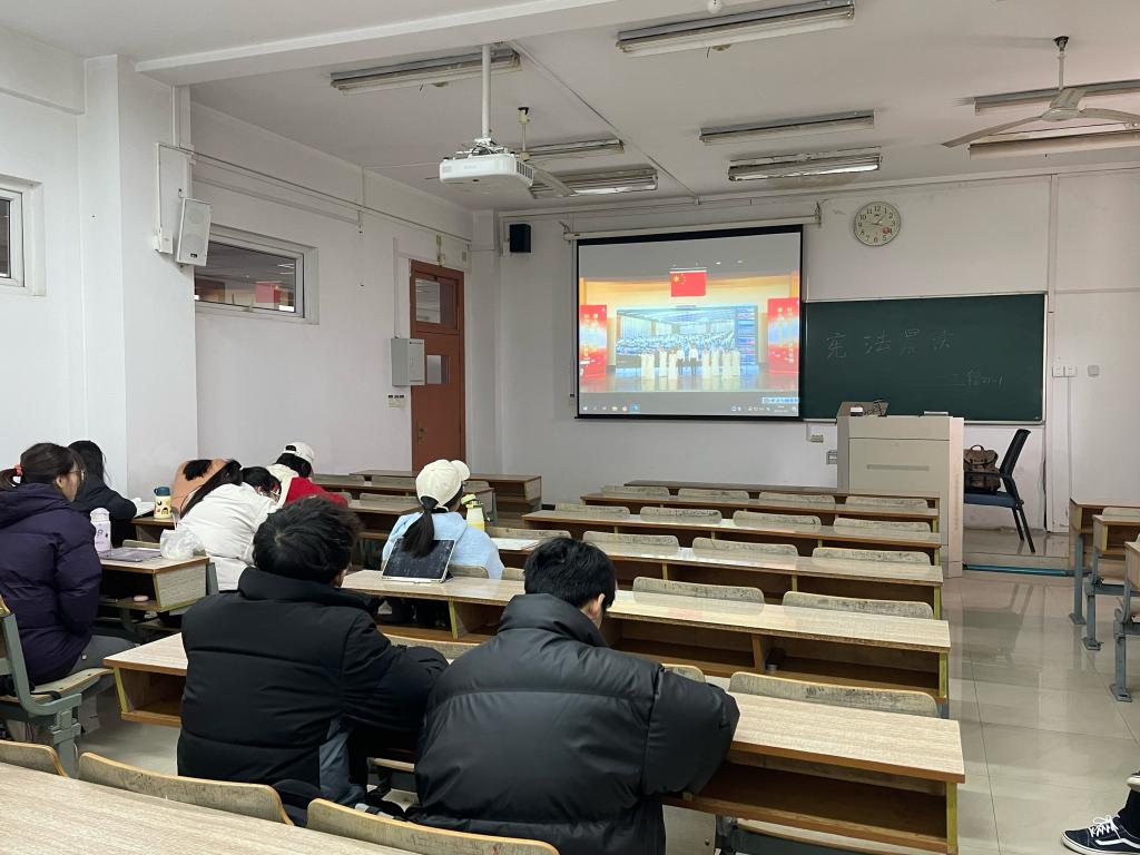 为大力弘扬宪法精神,建设社会主义法治文化,深入开展宪法学习宣传教育活动,12月4日上午,2021级全体同学通过普法网共同观看宪法晨读直播。管理2101班安全委员李启杰同学担纲组织。