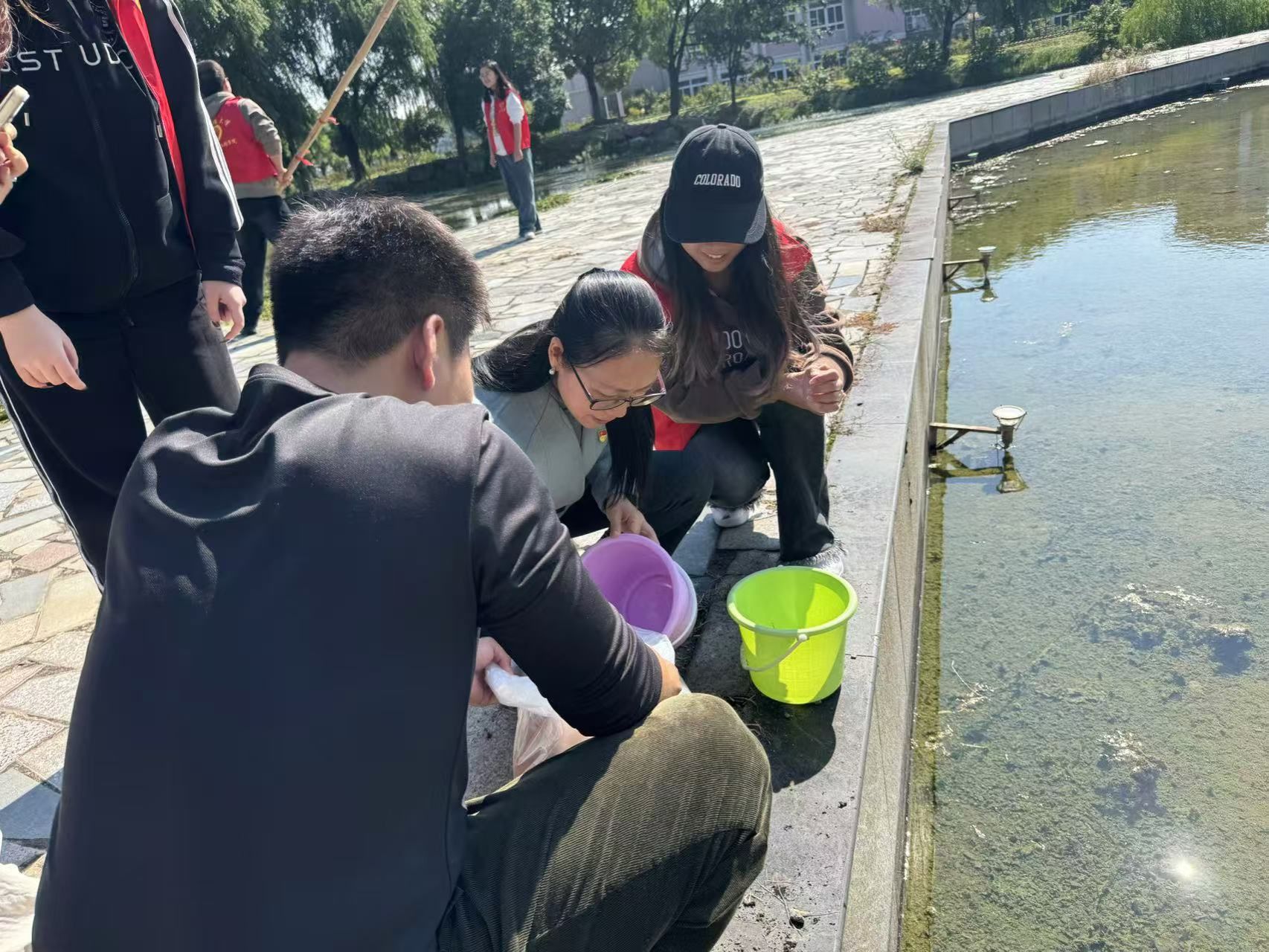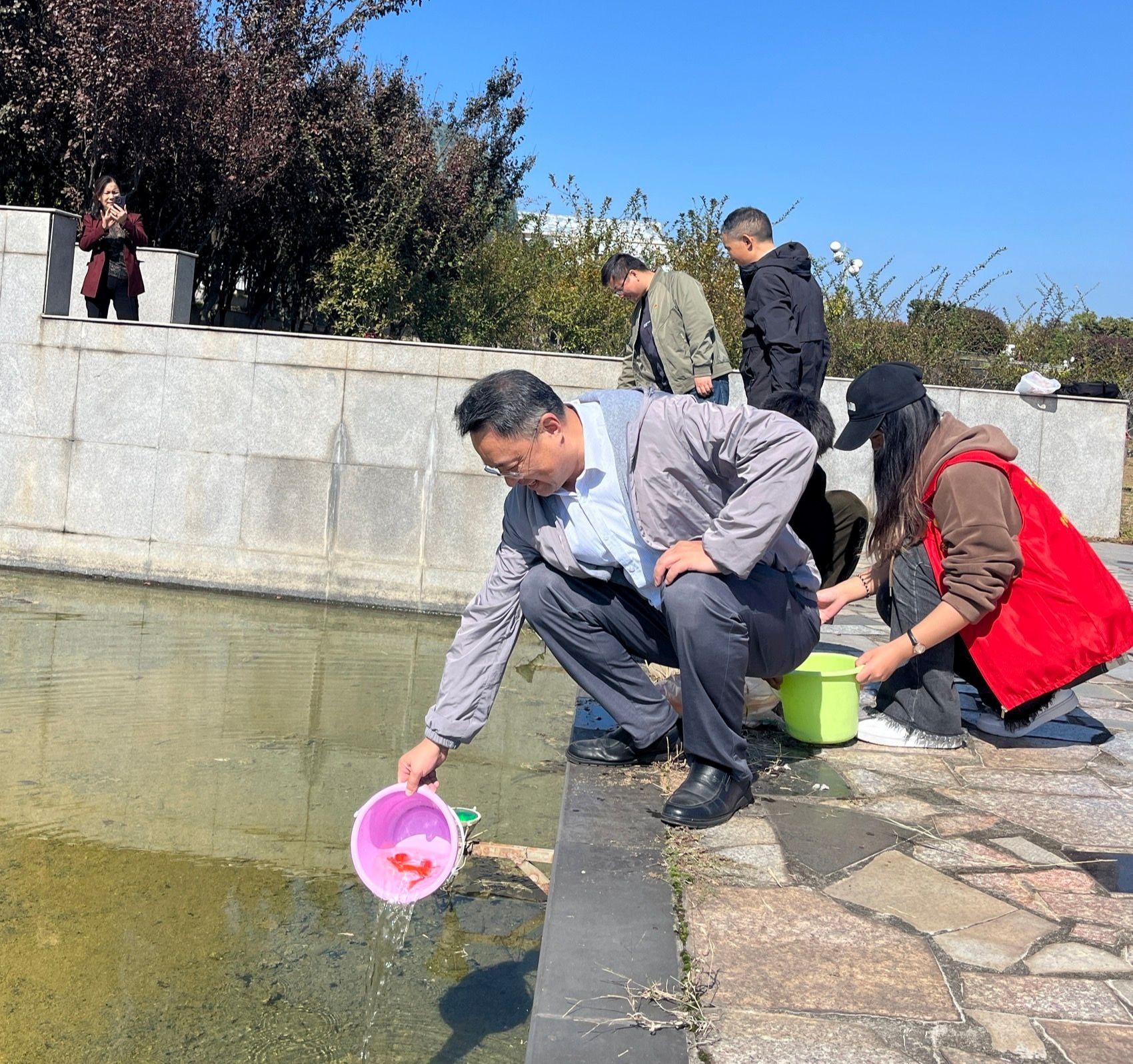 劳动结束后,师生们共同进行了锦鲤放生活动。大家小心翼翼地将一尾尾鲜活的锦鲤放入清澈的水中。鱼儿在水中欢快地游弋,仿佛也感受到了这份来自师生们的深情厚谊。经理刘军老师介绍,鲤鱼跃龙门是中华民族传统文化中象征着成功与希望的经典意象,它代表着公司对同学们的深切祝福和殷切期望。