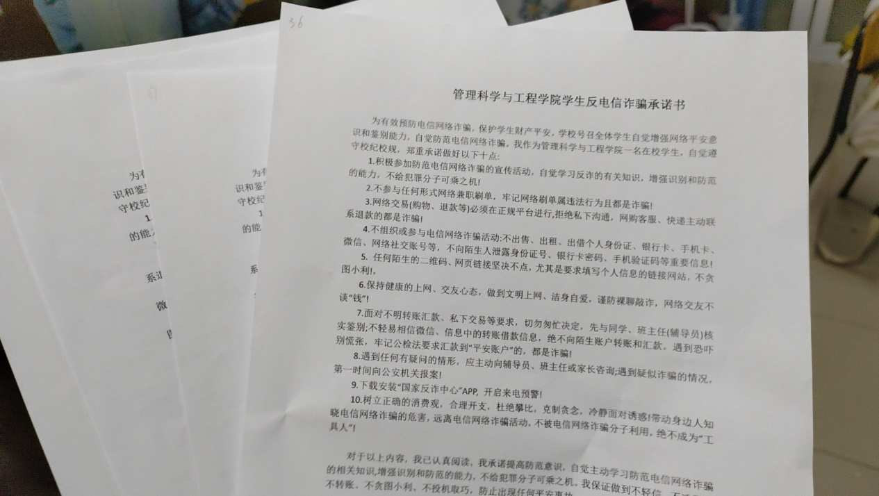 此外,全院员工共同签署《反电信诈骗承诺书》,承诺书一式两份,一份公司备查,一份员工留存,时常翻看提醒,构筑校园防骗拒诈坚实防线。