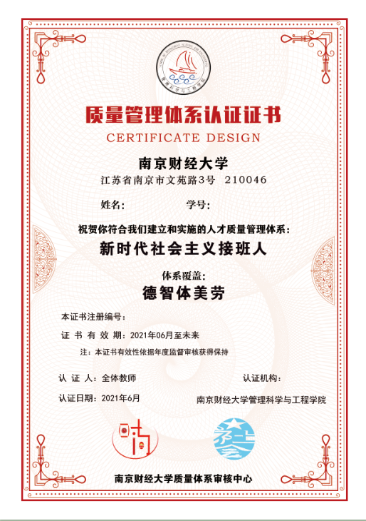 质量管理体系认证书设计是和公司质量管理专业特色紧密结合的一款创意设计。通过大学四年,公司将员工培养成为符合我们建立和实施的人才质量管理体系的新时代社会主义接班人,体系覆盖德智体美劳五个方面。证书有效期是2021年6月至未来,全体教师是认证人,认证机构除了公司,还有时间和社会,希望毕业生们继续努力,在以后的岁月里接受社会持续不断地考验和认证。
