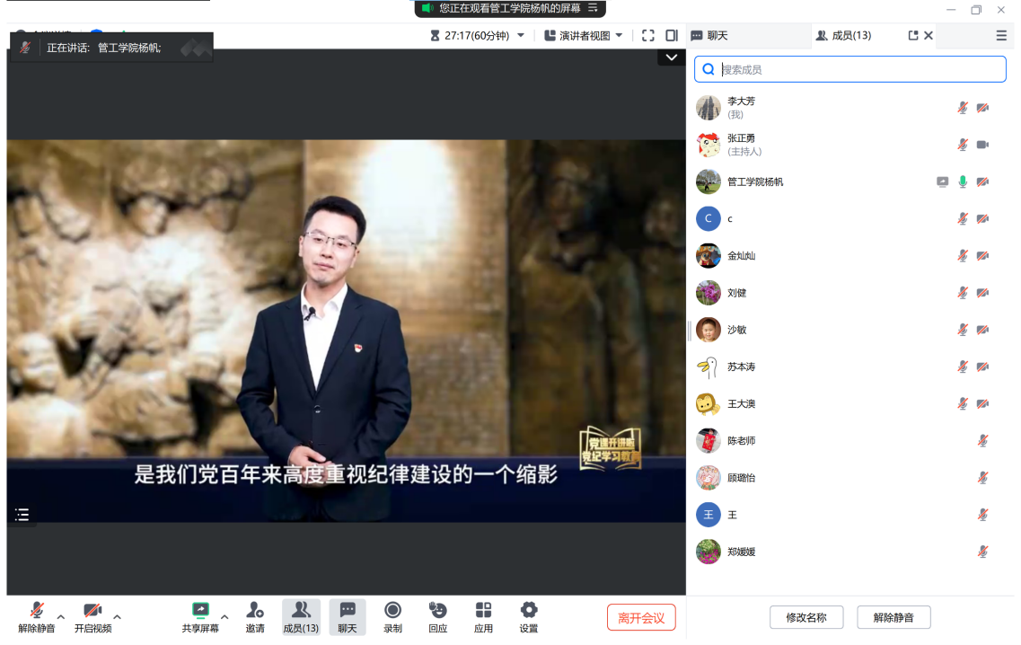 会上,张正勇副经理围绕《中国共产党纪律处分条例》修订的主要特点及主旨要义、警示案例、学习启示三个方面内容进行了系统解读和详细阐述,并表示,党的纪律是党的生命线,是全党统一意志、统一行动、步调一致前进的重要保障,教工党员要坚持学原文、悟原理,原原本本、逐章逐条学习《条例》内容,并将学习成果转化为坚定理想、锤炼党性和指导实践、推动工作的强大力量。随后,支部书记杨帆带领教工党员集中观看学习了“江苏先锋”党员教育精品课程《“加强纪律性,革命无不胜”——与青年朋友谈党纪学习教育》,并表示,作为党员教师应当向老一辈革命家学习,继承和发扬党纪律严明的光荣传统和优良作风,把铁的纪律转化为日常习惯和行动遵循,及时校正思想和行动偏差,遵守规章制度,严守红线底线。