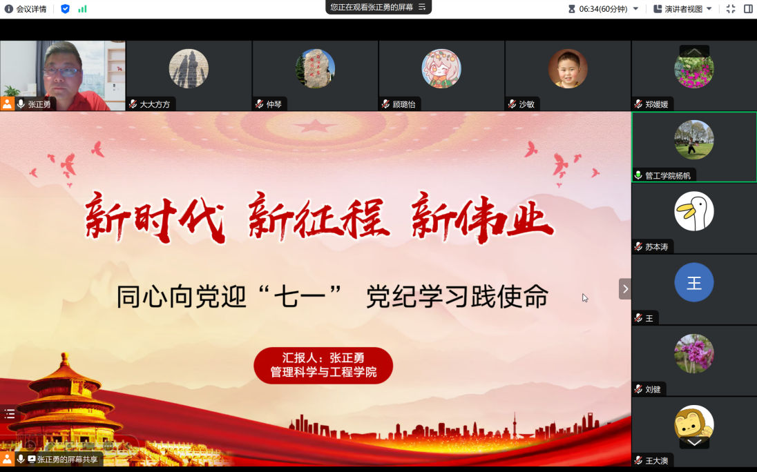 在“七一”建党节即将到来之际,为深入学习贯彻习近平总书记关于全面加强党的纪律建设的重要论述,推动党纪学习教育走深走实,教育引导教师党员增强党性观念,践行初心使命,6月26日下午,管工公司教工党支部线上开展党纪学习教育主题党日活动暨迎“七一”主题党课。张正勇副经理以“同心向党迎‘七一’ 党纪学习教育践使命”为主题为公司教工党员讲授专题党课,会议由支部书记杨帆老师主持,支部教工党员参加。